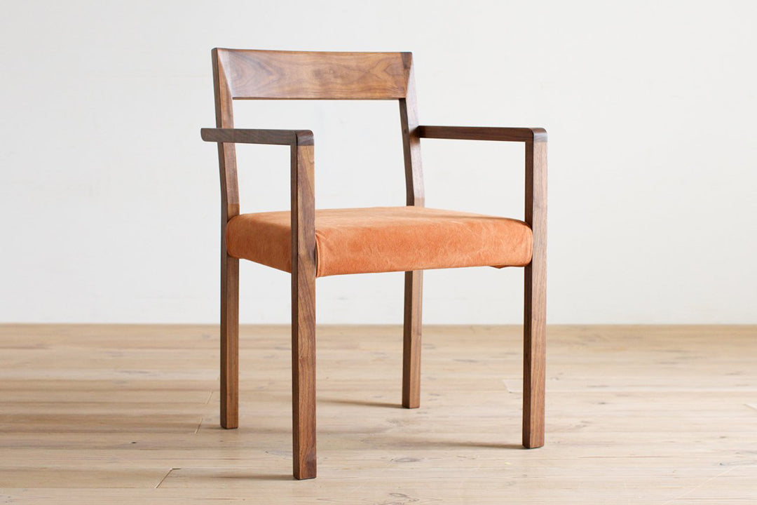 アームチェア FREX (フレックス)。装飾を抑えたシンプルで直線的な印象の椅子ですが、背もたれの浅いカーブと心地よさを追求した背座の角度により、座ると身体がしっくりと馴染む感覚があります。座面構造にはダイメトロール(布バネ)を使用し、ウレタンとの多層構造により快適なクッション性とへたりが少ない耐久性を兼ね備えています。