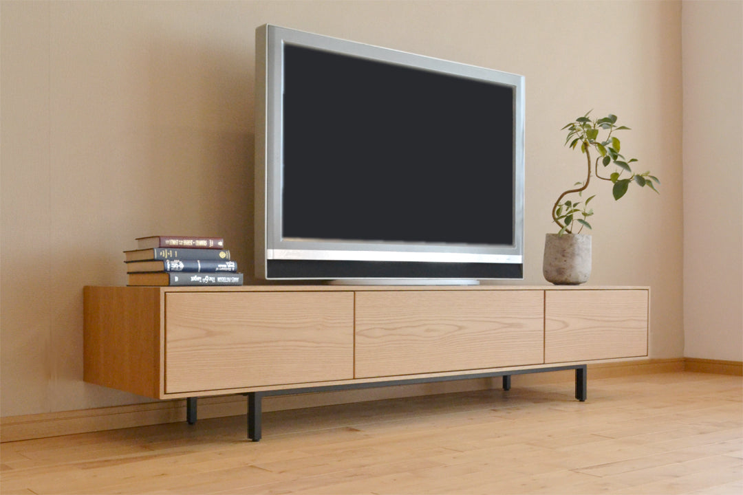 前面はすべて木目で覆われ、内部を見せない仕様で製作されています。中央の機器類収納部の扉はアクリルに突板を貼った仕様になっており、扉を閉めたままでもリモコン操作が可能です。機器類収納部の後方はHDDやルーターなど縦置きする小物機器が収納できるような工夫が施してあります。またその他の機器類の配線を収める役割もはたしてくれます。脚部は20mm角のスチールレッグを採用しており、木脚では再現できない軽やかでシャープな印象を与えてくれます。また脚部はスチールパイプではなくアイアンの無垢のワックス塗装仕上げ。敢えて荒削りな風合いを残した仕上げになっており、『カッコいい』インテリアにぴったりのアイテムです。