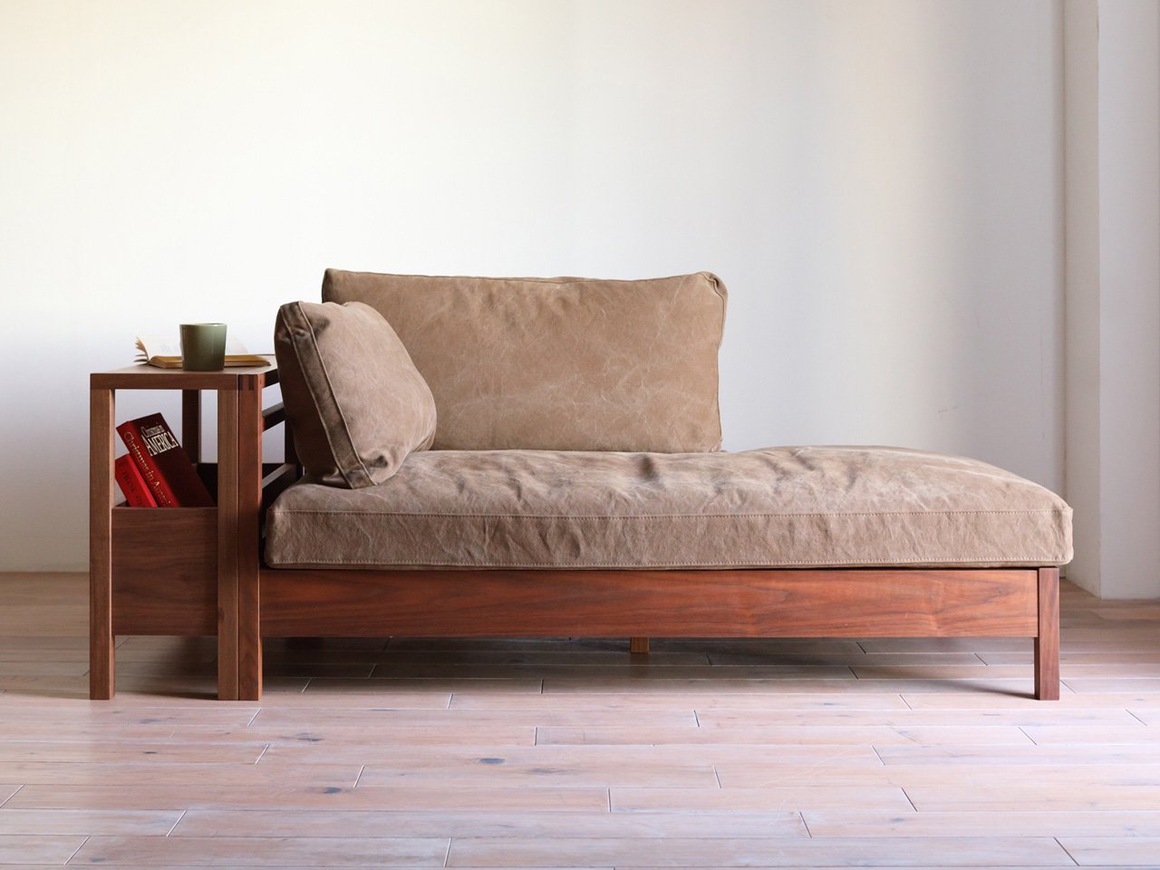 直線で構成されたフレームに、大きく分厚いクッションをぎゅっと詰め込んだソファです。囲われているような安心感があり、視覚的にも親しみやすさを感じられます。座クッションの厚みもこのソファの特長のひとつ。耐久性の強いチップウレタンを使用し、さらにその上にウレタンと羽毛を重ねた三層構造により、上質でもっちりとした座り心地をつくり出しています。