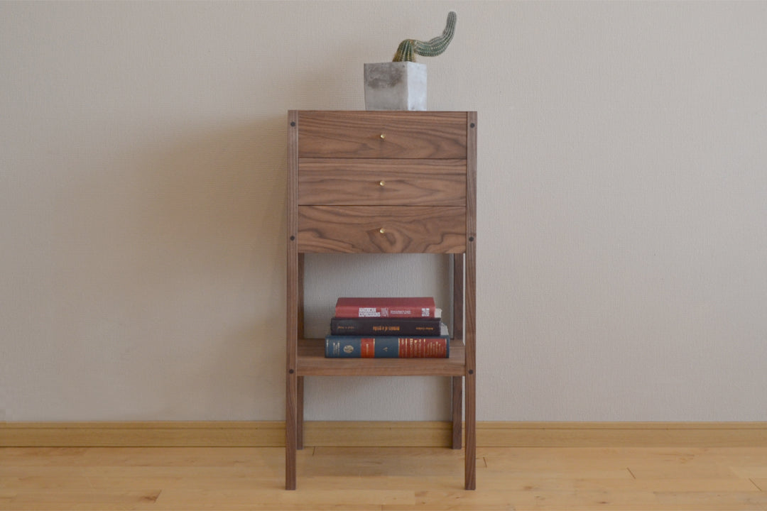 天板と前板を45度で製作する留め加工や引き出し内部の蟻組加工など職人の技術が垣間見える堅牢な作りとなっており長きに渡り使用できるクオリティで製作させています。