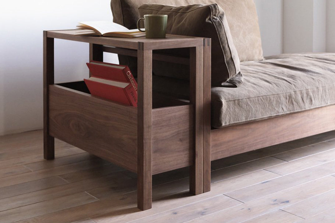 リポーゾソファの特徴的なフレームを踏襲した端正なつくりのリビングテーブル。天板と棚には天然木突板を、脚部と引出し前板に無垢材を使用し、木質感をたっぷりと感じていただけます。前後に引出しが一杯ずつ配されているため、オープン棚と合わせてリビング周りの収納を助けます。2サイズ展開。