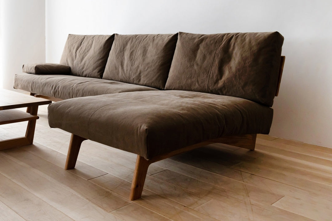 座った時に沈み込まないことで立ち座りがしやすく身体への馴染みの良いソファです。またアームレスタイプですので横からも入りやすく、ついつい足を伸ばして寝転びたくなります。