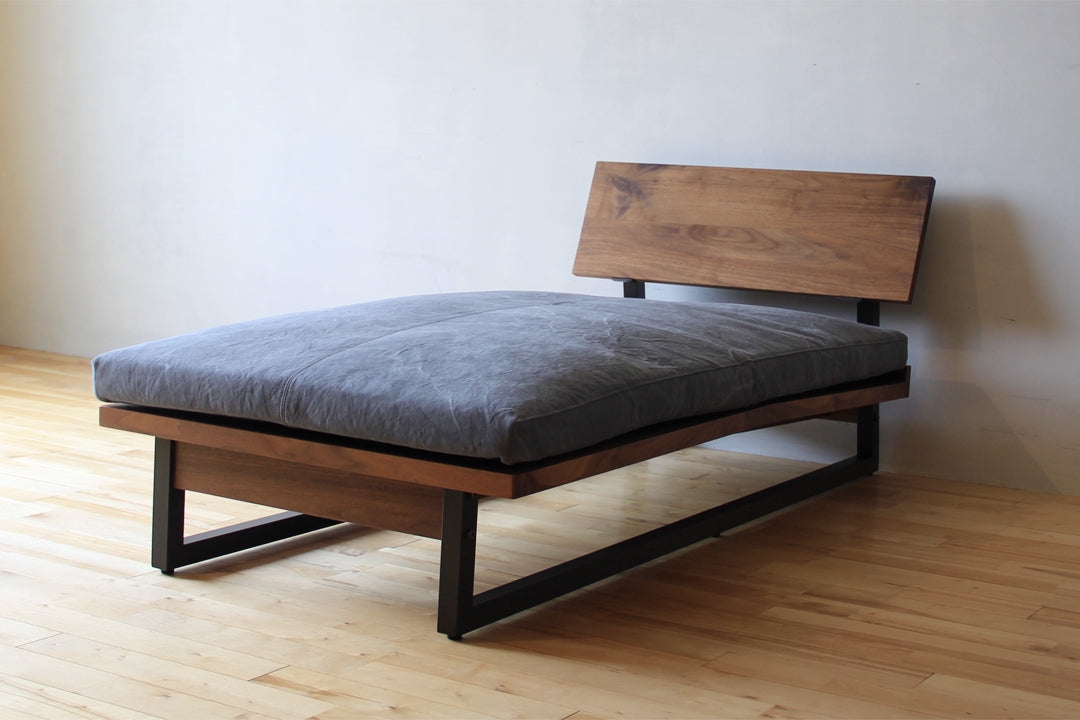 シェーズロングソファ084 FREX (フレックス)。広松木工の「FREX(フレックス)」シリーズは直線基調のシンプルな造形に、温かみのある「天然木」とクールなイメージの「スチール」という対照的なマテリアルのコンビネーションが印象的。