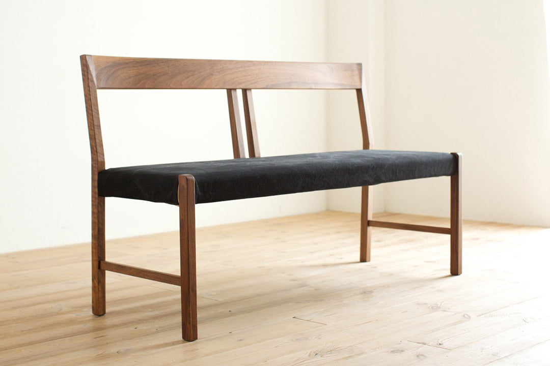 装飾を抑えたシンプルな構造の背付きベンチです。背もたれの中央に2本のラインが配されることで、強度が増すだけでなく、並んで座る時にもさりげなく自分のスペースを意識することができて安心感が生まれます。