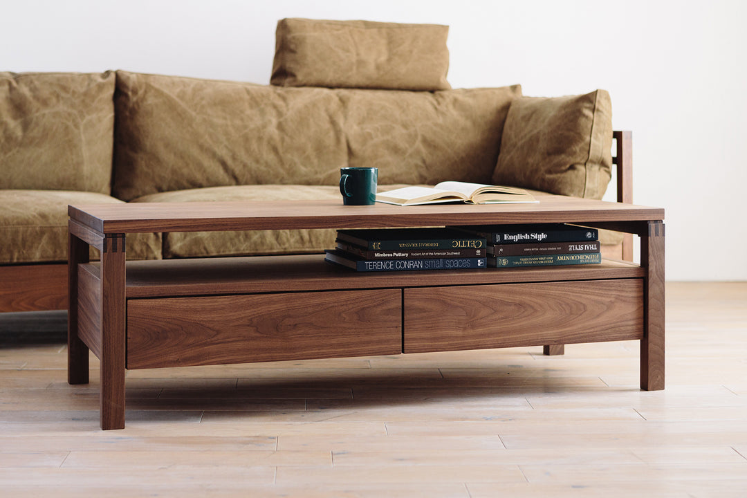 リポーゾソファの特徴的なフレームを踏襲した端正なつくりのリビングテーブル。天板と棚には天然木突板を、脚部と引出し前板に無垢材を使用し、木質感をたっぷりと感じていただけます。前後に引出しが一杯ずつ配されているため、オープン棚と合わせてリビング周りの収納を助けます。2サイズ展開。