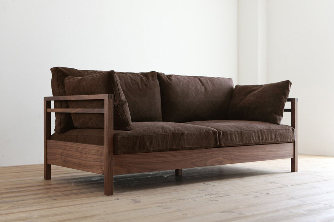 直線で構成されたフレームに、大きく分厚いクッションをぎゅっと詰め込んだソファです。囲われているような安心感があり、視覚的にも親しみやすさを感じられます。座クッションの厚みもこのソファの特長のひとつ。耐久性の強いチップウレタンを使用し、さらにその上にウレタンと羽毛を重ねた三層構造により、上質でもっちりとした座り心地をつくり出しています。