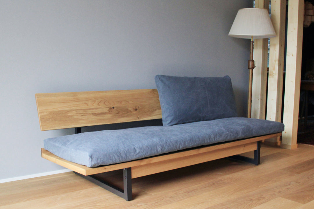 ソファ210 FREX (フレックス)。広松木工の「FREX(フレックス)」シリーズは直線基調のシンプルな造形に、温かみのある「天然木」とクールなイメージの「スチール」という対照的なマテリアルのコンビネーションが印象的。