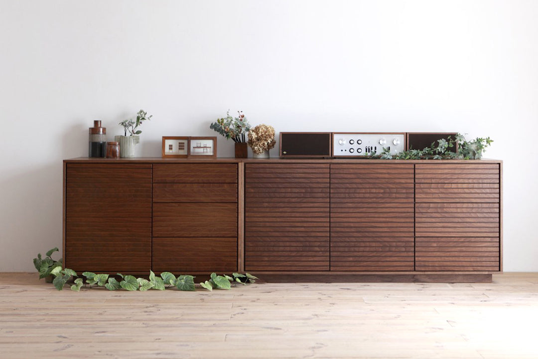 一見とてもシンプルでありながら、日本の美を思わせる端正な美しさと、天然木の質感をしっかりと感じられるシリーズ。洋室、和室を問わず、あらゆる空間に馴染みます。ただの横格子ではなく、同じく繊細なラインで構成されるフレームがこの家具のくっきりとした美しい存在感を引き出しています。