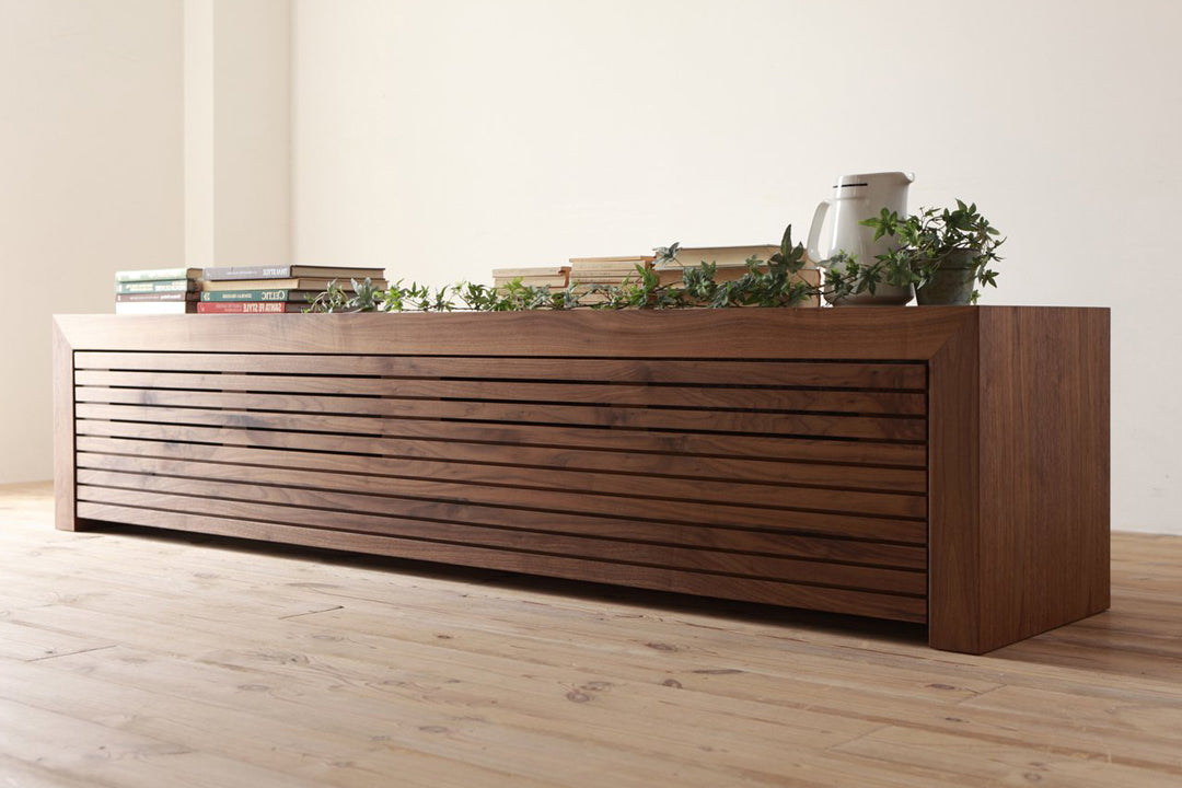 広松木工のテレビボード「ANIMA LATTICE(アニマラティス)」シリーズは収納部を分割して割り付けずに1枚の前板デザインにするなど、ミニマルを極めたシンプルデザイン。ただシンプルにするのではなく、ボリュームある外装で収納部を囲うことによりダイナミックで印象的なテレビボードに仕上げています。