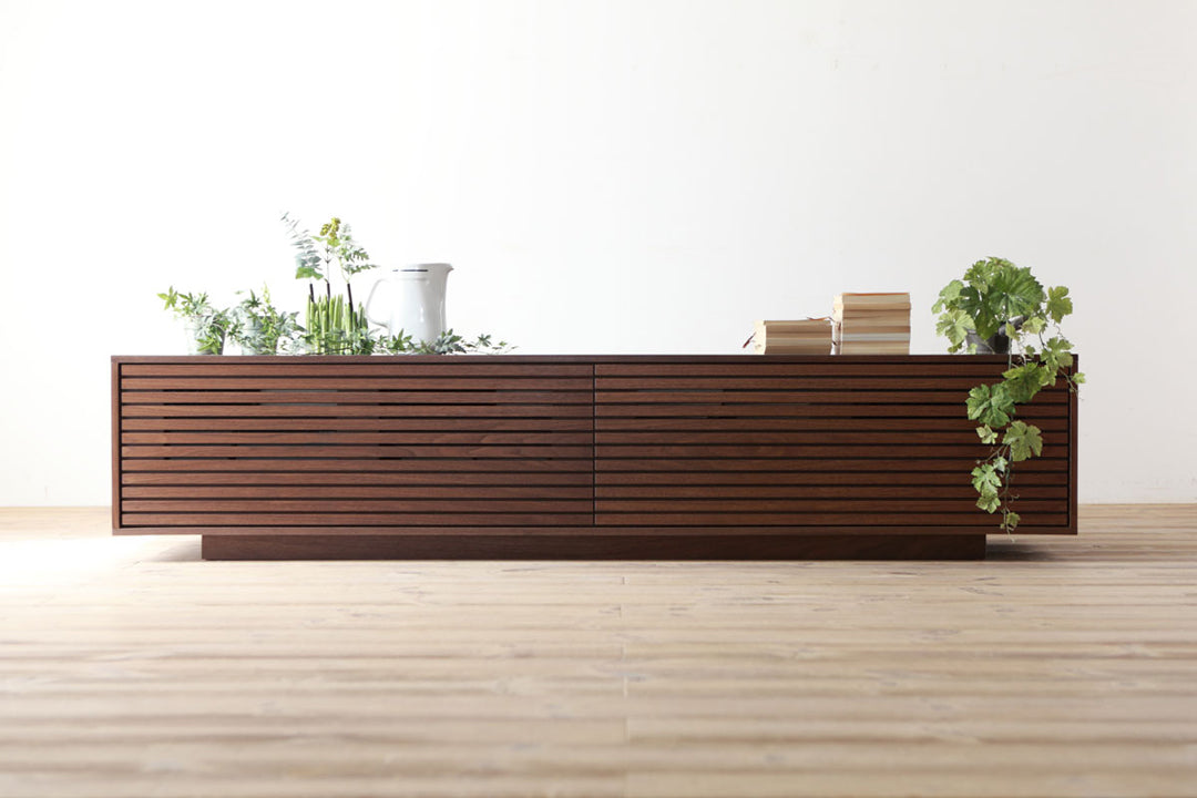 一見とてもシンプルでありながら、日本の美を思わせる端正な美しさと、天然木の質感をしっかりと感じられるシリーズ。洋室、和室を問わず、あらゆる空間に馴染みます。ただの横格子ではなく、同じく繊細なラインで構成されるフレームがこの家具のくっきりとした美しい存在感を引き出しています。