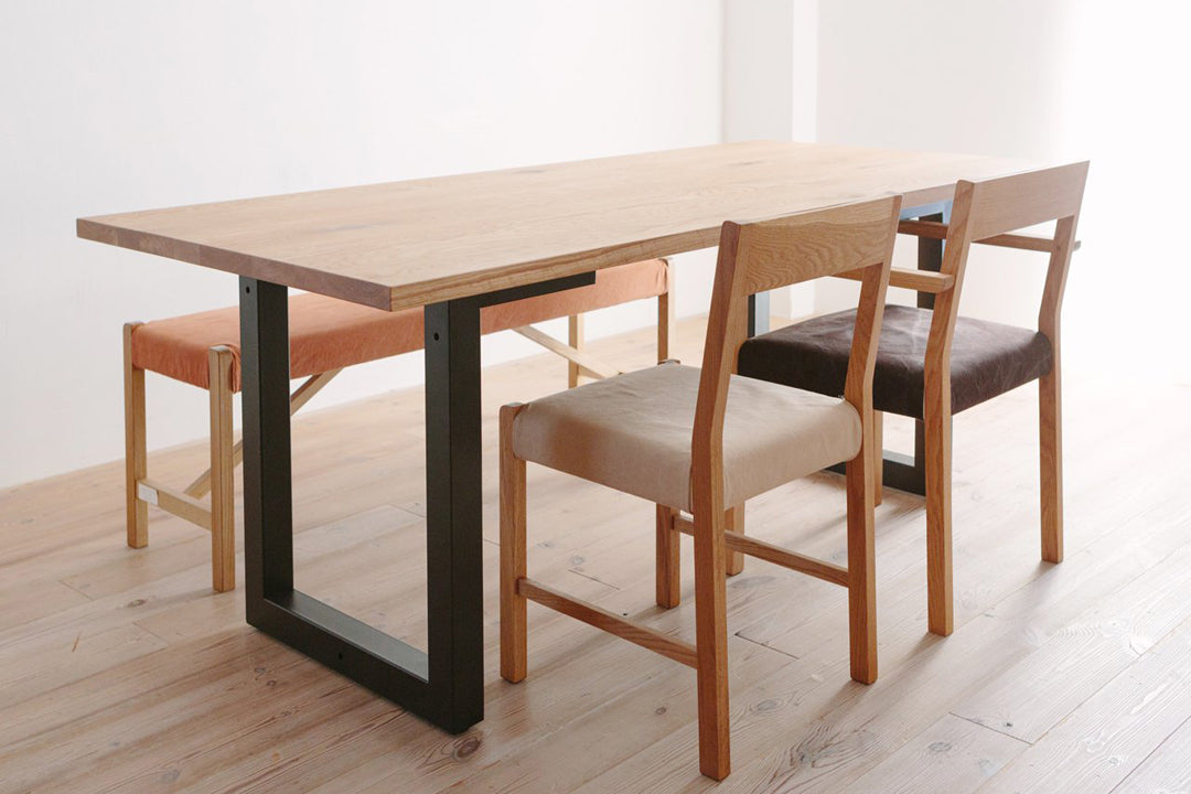 テーブル FREX (フレックス) 。広松木工の「FREX(フレックス)」シリーズは直線基調のシンプルな造形に、温かみのある「天然木」とクールなイメージの「スチール」という対照的なマテリアルのコンビネーションが印象的。