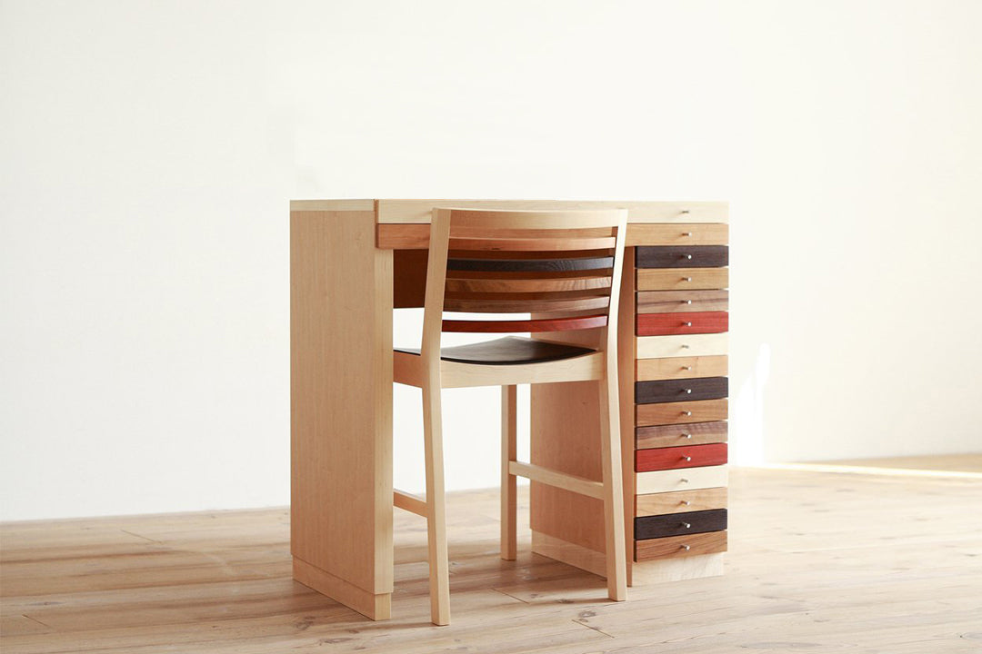 天然木は樹種によって固有の色味や木目の表情を持っており、それらの特徴をそのまま生かしたマルチカラーの家具たちは一見すると個性が強く主役的な存在ですが、あらゆるテイストのインテリアにも馴染んでくれる、なんとも不思議な家具たち。