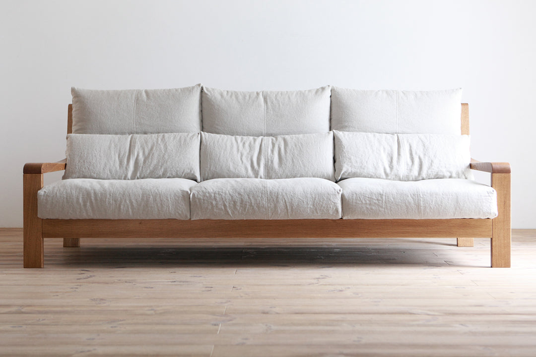 座クッションには耐久性の強いチップウレタンを使用し、さらにその上にラバータイプウレタンと羽毛を重ねた3層構造。ゆっくりと沈んでいくような座り心地です。