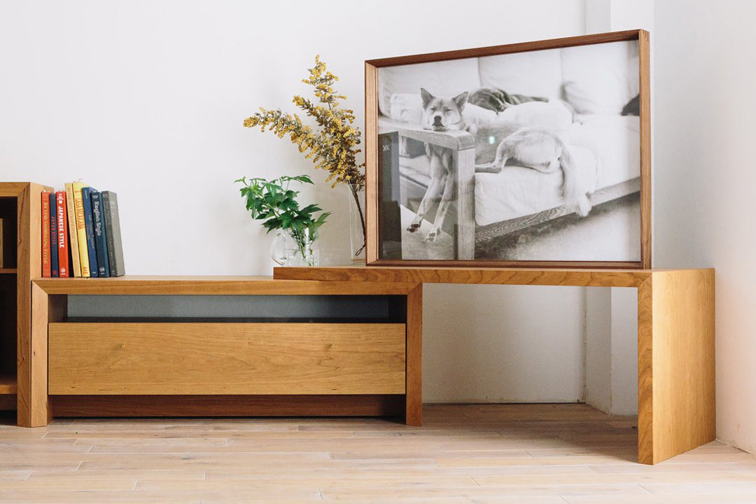 シンプルなデザインはそのままに、エッジの効いたディテールを取り入れ現代のインテリアに合わせやすいモダンな雰囲気をプラス。主張しすぎない上品な真鍮磨きのツマミなど、広松木工らしいマテリアルセレクトです。