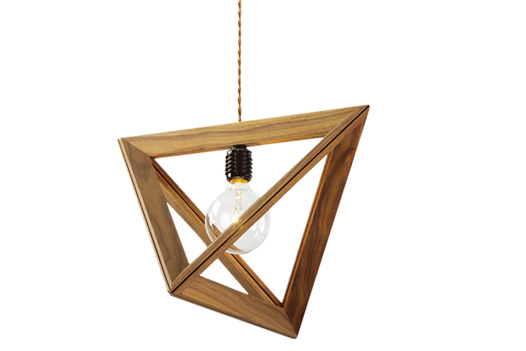 4面のトライアングルのフレームで構成されるペンダントライト。見る角度によって形の印象が変わる美しい造形が魅力です。シェードの素材はウォールナット材(BR)、アッシュ材(NA)からお選びいただけます。コードはねじりコードを使用しており、BR(ウォールナット材)の場合はブラウン色、NA(クリ材)の場合はレッド色となります。