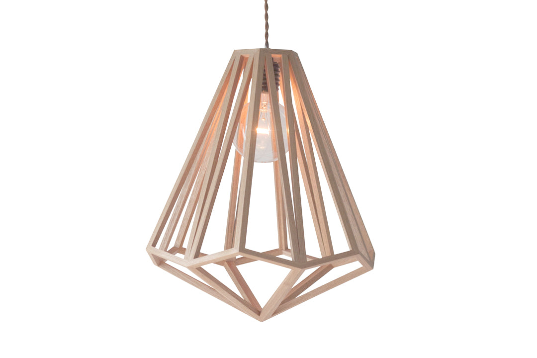 無垢材を熟練の職人が木口(木の断面)を見せない留加工で丁寧に組みあげて製作されています。無垢材の自然な風合いを生かした存在感のあるフォルムが特徴のペンダントライトです。