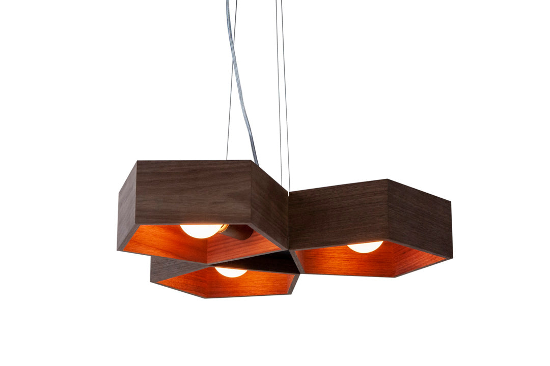 ウォールナット無垢材を贅沢に使用し、五角形を3個組み合わせたペンダントライト。真鍮のソケットカバーとの相性も良く、見る角度によって違った印象を与えます。リビング、ダイニングにおすすめです。