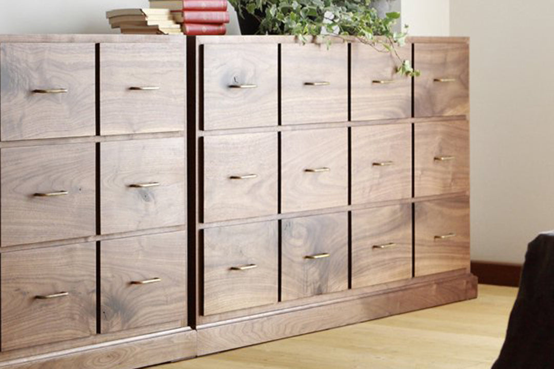 前板に節あり無垢材を使用した、木質感たっぷりの収納チェスト。同じサイズの引出しが整然と並んでいるように見えますが、実は一段目は小引出し、二段目・三段目は大引出しになっています。大きさの違う引出しがあることで、暮らしの中での整理整頓がしやすくなります。収納力はありますが、奥行きを抑えているため圧迫感を感じにくく、天板上でディスプレイも楽しめます。