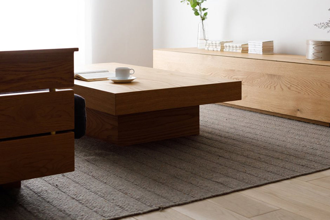 シンプルな構造のセンターテーブル。10cmもの厚みがある天板の端正なつくりと、天然木の自然な美しさがそのままデザインとなっています。床材やソファに合わせてお選びいただけるように木の展開も豊富。天板サイズの展開も幅広く、リビングの空間に合わせてお選びいただけます。